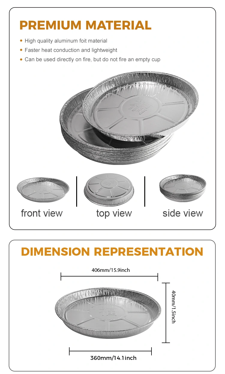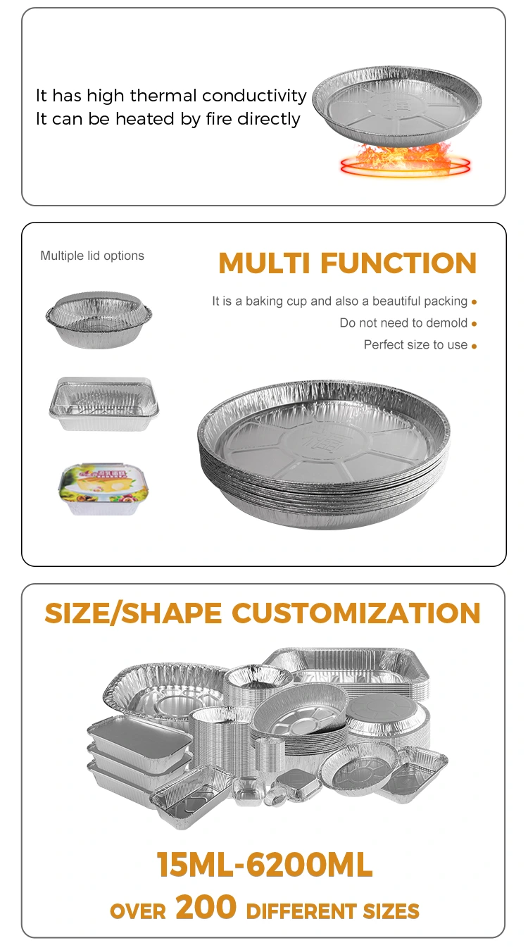 Поставщик поставщика алюминия Yunchu Aluminum Foil Model YR3700 ОПЛАТА ПРИВЕРСТВА ПЕРЕЙНА СЕРИОНАЛЬНАЯ АЛУМИНЕВ ФОИЛЬНА ПРИМЕНЕНИЕ ПРИМЕНЕНИЕ ПРИМЕНЕНИЕ. Контейнер имеет диаметр 406 мм (около 15,9 дюйма) вверху, 360 мм (около 14,1 дюйма) в диаметре внизу, высота всего 40 мм (около 1,5 дюйма) и емкость около 3700 мл (около 130,5 унции). Открытое пламя Паринг является удобным, а гигиеничная выпечка в духовке, высокая температурная сопротивление 400 ° C не сожжена и не сломана, выпечка в духовке не является липкой, не боясь жирного и умышленного барбекю, из -за его способности напрямую связываться с открытым планом, пользователи не нужно беспокоиться о проблемах безопасности. Контейнеры из алюминиевой фольги устойчивы к высоким температурам, очень устойчивы к выпечке, и их нелегко сжечь или разрываться. Край полного рулона без масла, что предотвращает прилипание пищи к стене кастрюли, а защита более интимна.