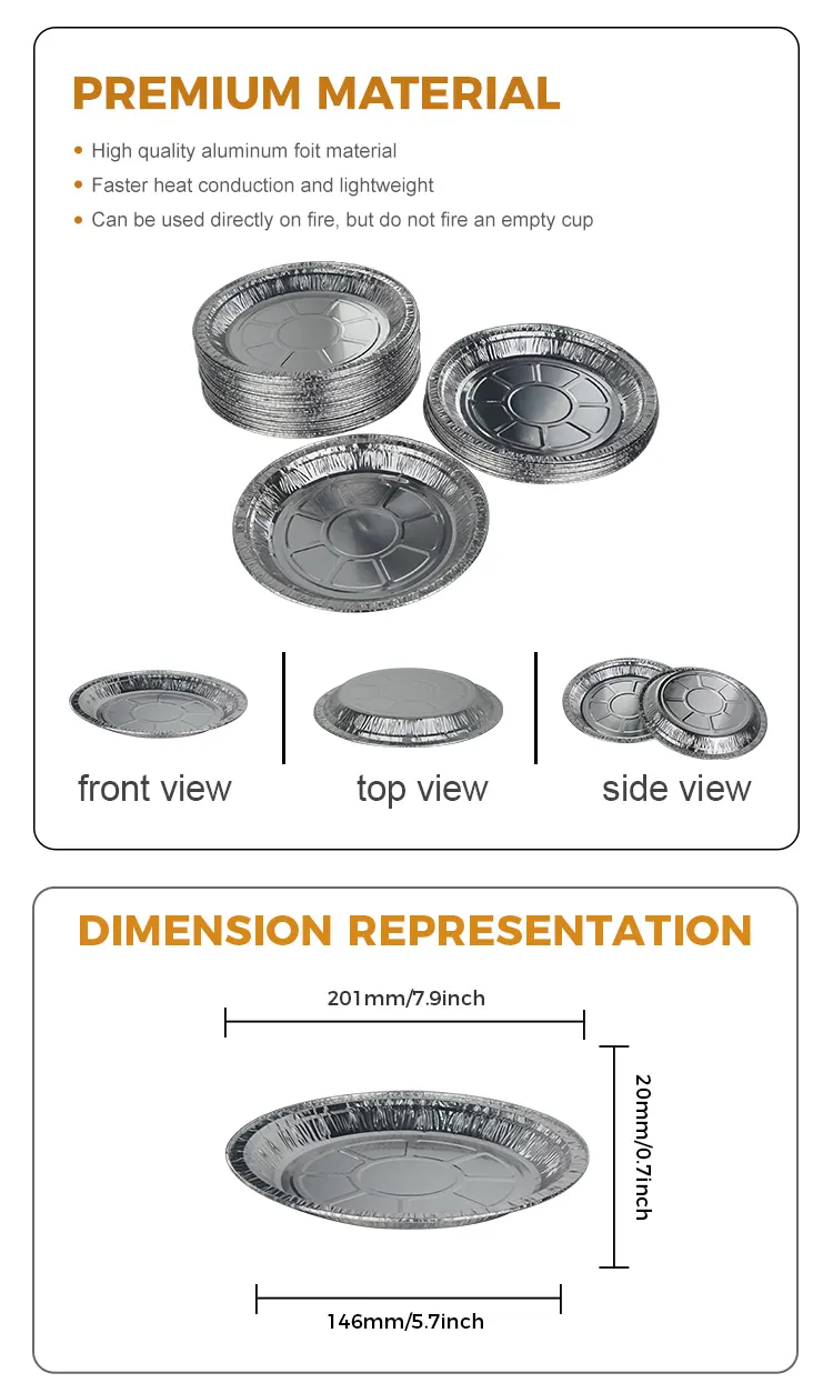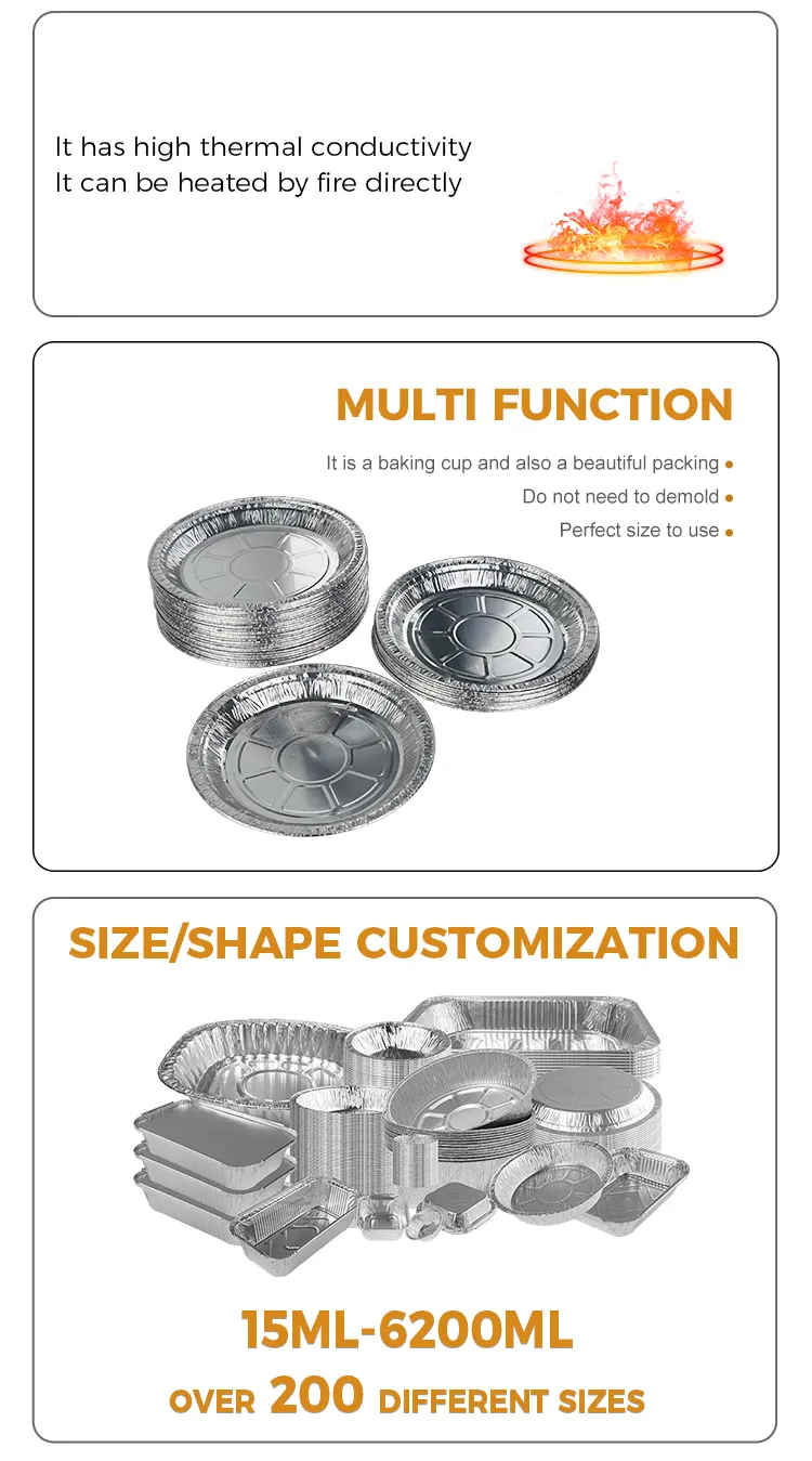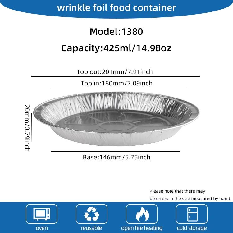 Одноразовая дисковая фритюрница Yunchu из алюминиевой фольги. Контейнер из серебряной алюминиевой фольги является гигиеничным и экологически чистым. Он изготовлен из утолщенных и устойчивых к коррозии материалов, которые нелегко деформируются и могут находиться в прямом контакте с пищевыми продуктами. Он не боится высоких температур, не горит, не пригорает и его нелегко выбросить. Он выдерживает высокие температуры до 250°C и подходит для различных способов приготовления, таких как запекание при высокой температуре, духовка и барбекю, поэтому вам не о чем беспокоиться. Доступно множество спецификаций для удовлетворения разнообразных потребностей в выпечке различных размеров, что позволяет легко справиться с различными требованиями производства продуктов питания.