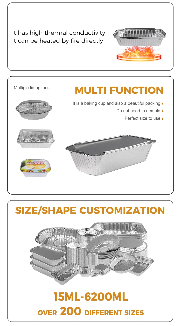 Эти одноразовые контейнеры из алюминиевой фольги из шерсти с фаст-фудом изготовлены из высококачественного материала алюминиевой фольги 8011, который обладает хорошим эффектом сохранения тепла и может поддерживать температуру пищи, делая пищу более вкусной и вкусной. Кроме того, наш прямоугольный контейнер с алюминиевой фольгой барбекю также оснащен теплоизоляционной функцией, которая может быть в сочетании с крышкой алюминиевой фольги или пластиковой крышкой для домашних животных, которая удобна для настраиваемого логотипа и дополнительно улучшает изображение бренда.