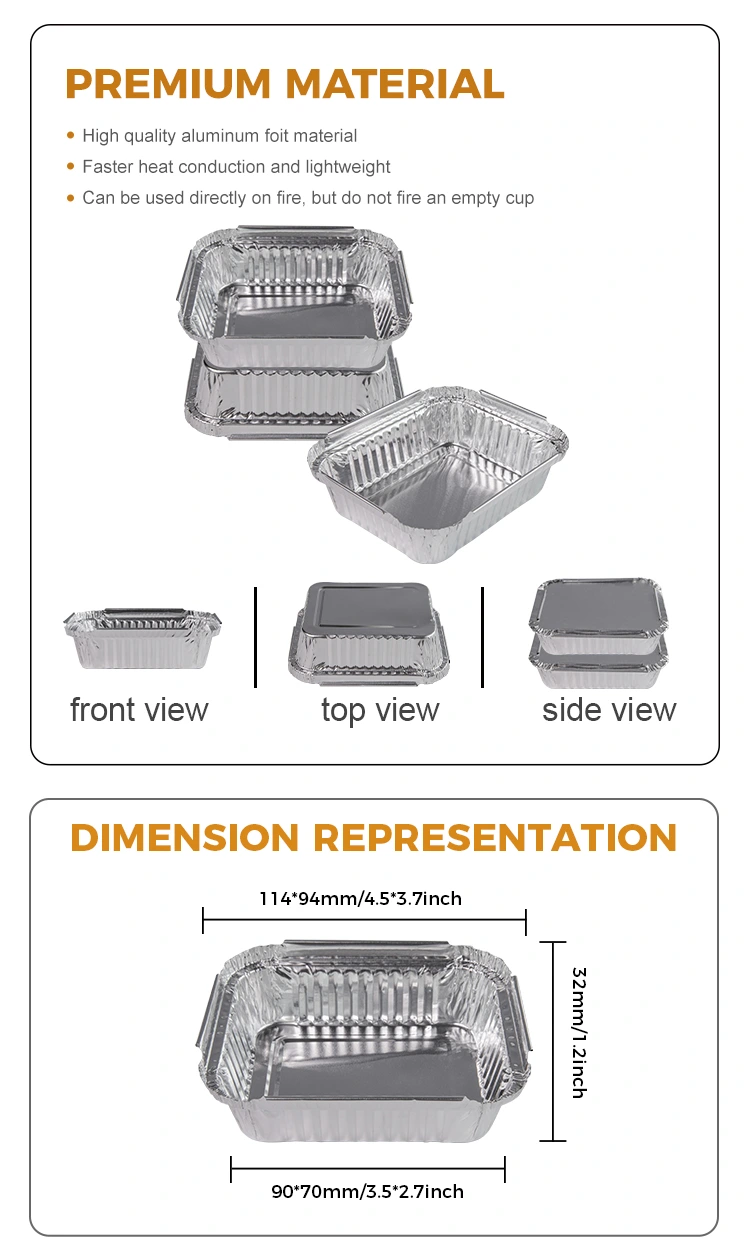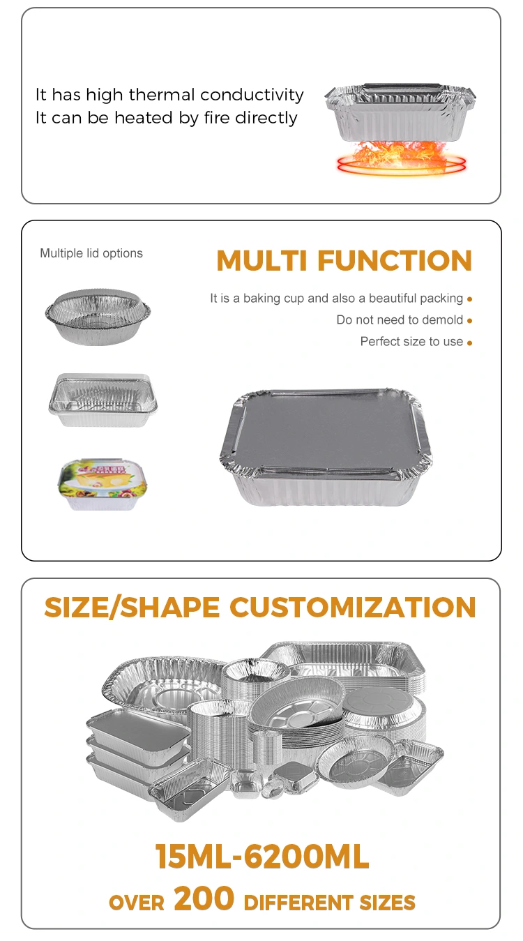 Кроме того, этот одноразовый ланч для барбекю серебряной алюминиевой фольги также чрезвычайно безопасен, так как его можно обычно использовать под открытым пламенем, не беспокоясь о пожарных опасностях. В то же время его превосходная температурная устойчивость и герметизация также обеспечивают гарантию безопасного транспортировки продуктов питания, что позволяет потребителям и клиентам использовать ее с большей уверенностью.