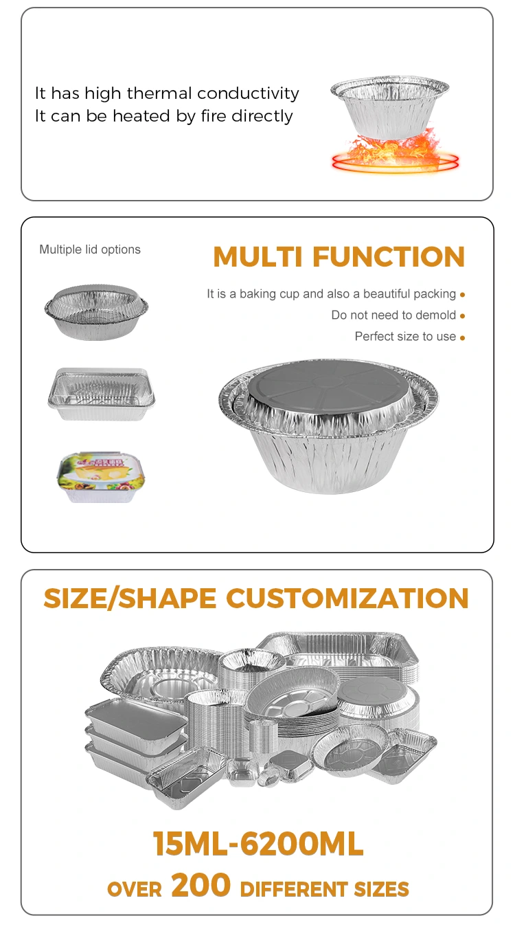 Серебряная фольга для алюминиевой фольги для алюминиевой фольги, уникальный дизайн, имеет уникальный дизайн, легкий и прост в использовании, весом всего 9,9 грамма, что облегчает складывание и хранение, сохраняя пространство и время размещения. Продукт производится с использованием расширенного процесса легкой стены с гладкой и плоской поверхностью, что делает его идеальным для маркировки и сканирования после обработки пищевых продуктов в крупных супермаркетах. Его просторной способности достаточно, чтобы держать разнообразные ежедневные продукты и закуски, удовлетворяя разнообразные потребности в использовании. Как одноразовый продукт, нет необходимости чистить его, значительно снижая затраты на рабочую силу. Кроме того, продукт оснащен алюминиевой крышкой для домашних животных и алюминиевой тепловой пленкой, которая имеет отличную утечку масла и водонепроницаемость и может поддерживать стабильность и деформацию при высоких температурах, тем самым улучшая эффект свежести и сохранения тепла, особенно при запечатанной и транспортировке.