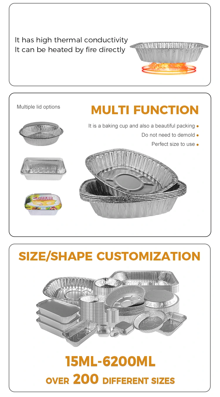 Этот продукт является одноразовым продуктом и не нужно очищать, что экономит затраты на рабочую силу. Он может быть в паре с PET, полностью прозрачной крышкой алюминиевой фольги, которая эффективно предотвращает утечку пыли и жидкости. Долговечность и безопасность продукта повышаются за счет конструкции жесткости и обычной вогнутой и выпуктной формы дна. Портативная конструкция позволяет легко переносить и нагреваться, устойчивая к высоким и низким температурам, способным использовать в температурном диапазоне от -20 ° C до 250 ° C, и является непроницаемой для масла и воды, усиливая удержание тепла и затянутую транспортировку продукта.