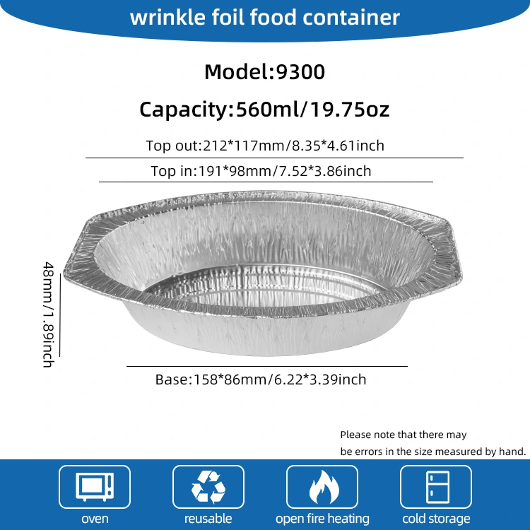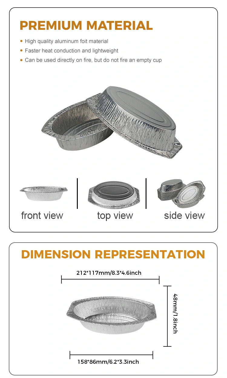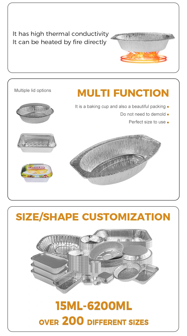 Поставщик алюминиевой фольги Yunchu предлагает контейнеры из алюминиевой фольги из овального хлеба для домашней кухни, пекарни, цепных магазинов и доставки охлажденных продуктов. Этот контейнер, созданный из пищевой алюминиевой фольги, имеет уникальную овальную форму, которая выделяет его среди множества серебряных ящиков для выпечки. Этот контейнер особенно подходит для хранения горячих платок, фруктов, хлеба и всевозможных ретортных продуктов, и может удовлетворить потребности широкого спектра посуды. Из -за хорошей теплопроводности, он может равномерно рассеивать высокие температуры, гарантируя, что пища равномерно нагревается. Кроме того, он обладает определенной нагрузкой и сопротивлением давлению, поддерживая стабильность даже в случае нескольких стеков, предотвращая деформацию и идеально подходит для использования во время транспортировки. Чтобы лучше адаптироваться к различным сценариям и потребностям, этот контейнер также может быть настроен в соответствии с требованиями клиента и обеспечивает соответствующие крышки для дополнительной практичности.