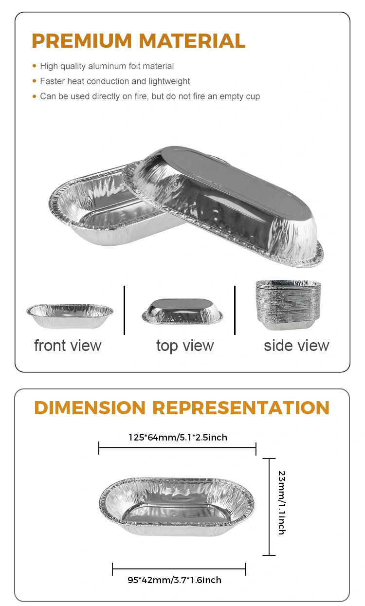 Контейнер с овальной серебряной фольгой Yunchu Oval - это очень скромный размер, с диаметром верхней части 125*64 мм (5,1*2,5 дюйма), диаметром базового размера 95*42 мм (3,7*1,6 дюйма), высотой всего 23 мм (1,1 дюйма) и емкостью 105 мл (3,7 унции). Этот размер не только прост в ношении, но и может удовлетворить различные потребности в использовании.