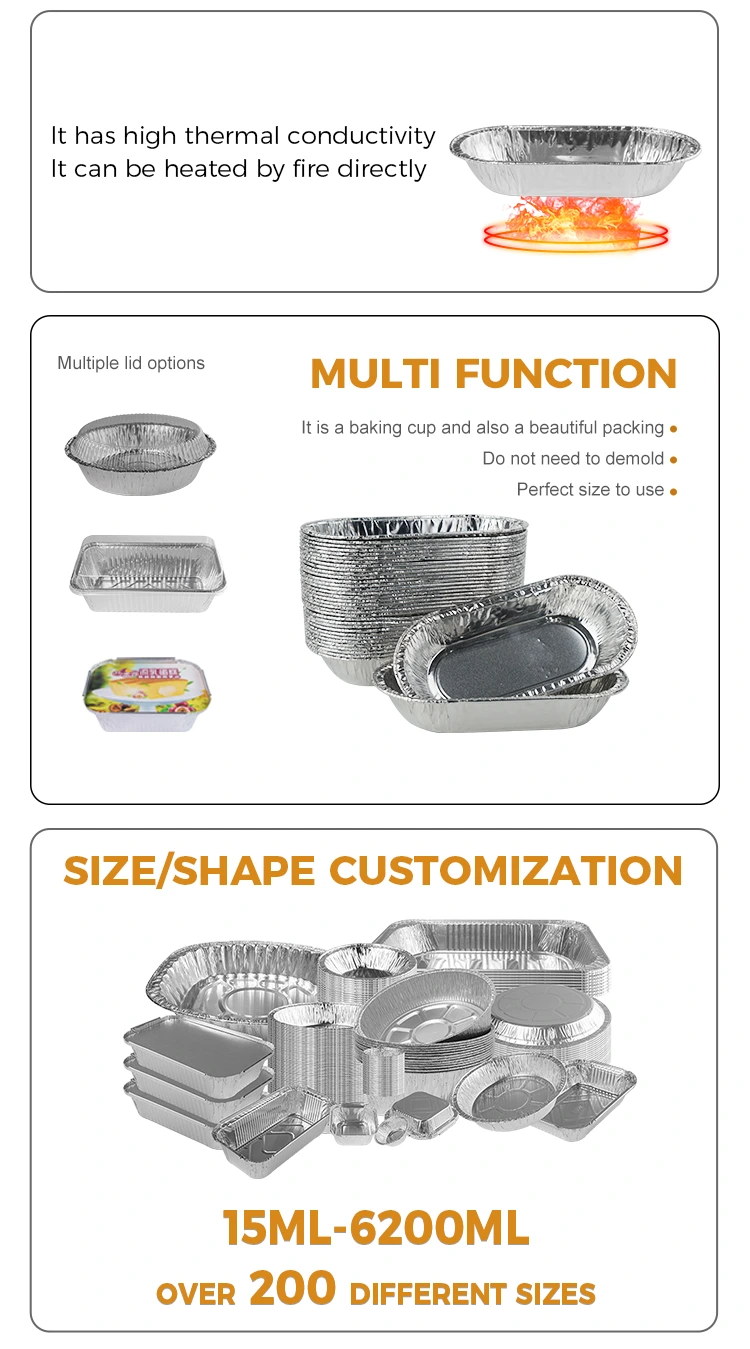 Из -за своего небольшого и легкого дизайна этот овальный контейнер с алюминиевой фольгой с серебряной алюминиевой фольгой идеально подходит для переноски и хранения продуктов питания, подходящего для использования и настройки продуктов питания в магазинах, ресторанах быстрого питания и многого другого. Вогнутая и выпуклая конструкция текстуры внизу помогает усилить трение и равномерно распределять тепло и избежать локального перегрева. Кроме того, ящик из алюминиевой фольги была утолщена для повышения сопротивления сжатия и долговечности, и она может оставаться стабильной даже во время транспортировки и нелегко деформировать.