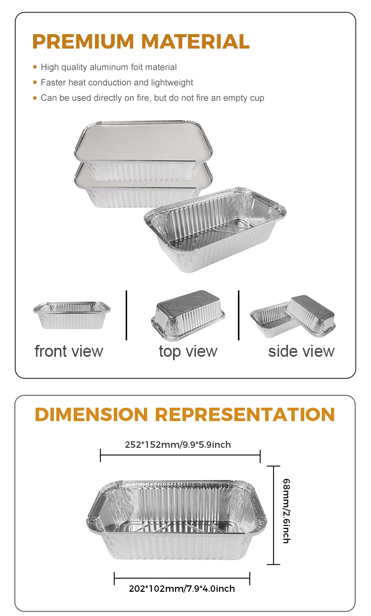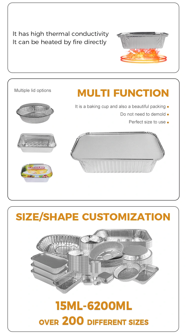 Алюминиевая фольга Yunchu Эта прямоугольная воздушная фритюрная упаковка серебряной алюминиевой фольги изготовлена ​​из высококачественного алюминиевой фольги 8011, который обладает отличными теплоизоляционными характеристиками и может эффективно поддерживать температуру пищи, что делает пищу более вкусной и вкусной. В то же время наш прямоугольный контейнер с алюминиевой фольгой барбекю также оснащен функцией сохранения тепла, которая может быть достигнута путем сопоставления ее с крышкой алюминиевой фольги или пластиковой крышкой для домашних животных, что удобно для индивидуального логотипа и, таким образом, улучшает изображение бренда.