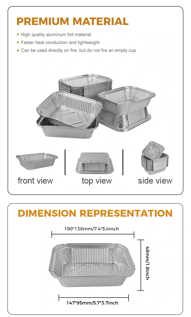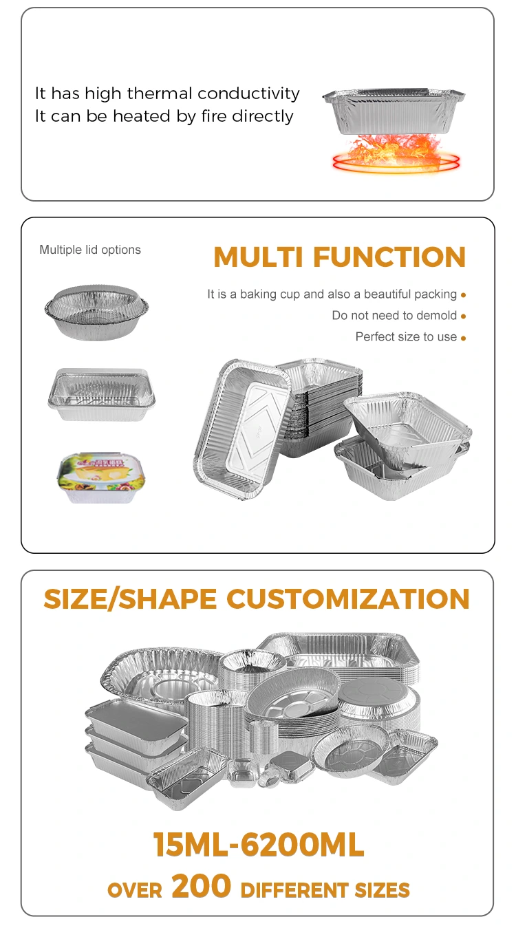 Ланч-боксы из алюминиевой фольги, которые мы поставляем, изготовлены из алюминиевой фольги 8011, которая обладает отличными теплоизоляционными свойствами и может эффективно поддерживать температуру продуктов питания. В частности, наш прямоугольный контейнер из алюминиевой фольги серебристого цвета для выпечки ланч-боксов не только обладает свойствами сохранения тепла, но также может использоваться с крышкой из алюминиевой фольги для облегчения индивидуальной настройки ЛОГОТИПА.