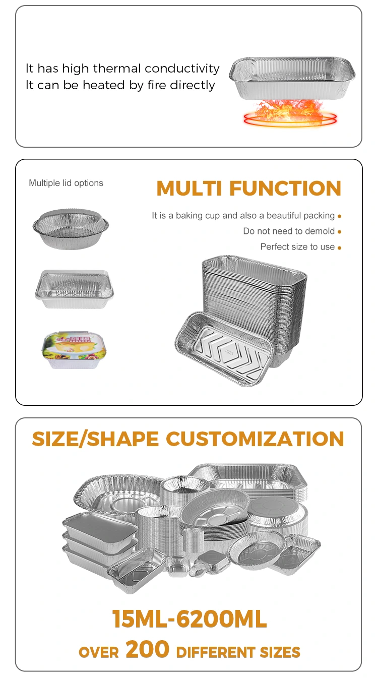 Особенности: Lanch Box Оптовая алюминиевая фольга. Кроме того, наш прямоугольный контейнер с алюминиевой фольгой с серебряной алюминиевой фольгой также имеет функцию сохранения тепла, которая может быть сопоставлена ​​с крышкой из алюминиевой фольги и пластиковой крышкой для домашних животных, что удобно для настройки логотипа, еще больше углубления впечатления от клиента и улучшения имиджа бренда.