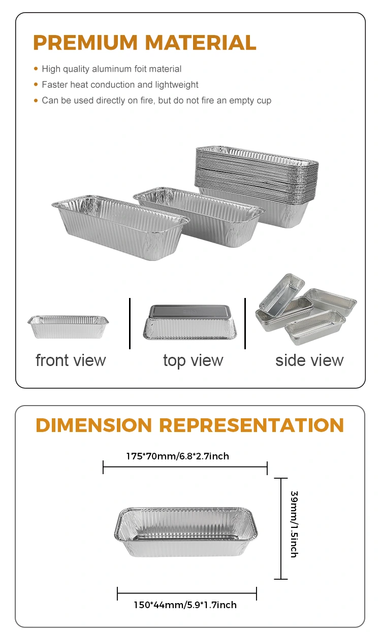 Серебряная алюминиевая фольга с прямоугольным подносом хлеба, предоставленные поставщиком алюминиевой фольги Yunchu, изготовлены из пищевых материалов и подходят для различных сценариев применения. Этот продукт особенно подходит для целей на гриле и выпечке, таких как изготовление длинных хлеб или выпечки. Будь то для приземления по углу или в качестве коробки доставки на вынос, он идеально подходит для использования.