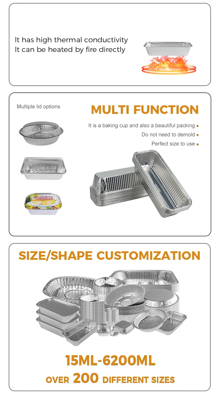 Алюминиевая фольга с алюминиевой фольгой с серебряной алюминиевой фольгой -контейнерами с серебряной алюминиевой фольгой поддерживает различные методы отопления, так что вы можете наслаждаться удовольствием выпечки в любое время, и эффект сохранения тепла примечателен. Обновленная и утолщенная конструкция, выбранная высококачественная экологически чистая материалы, пищевая алюминиевая фольга, цельная формовочная конструкция более надежна. Огромный дизайн края проводит тепло быстро и равномерно, что делает его менее вероятной сжиганием дна во время выпечки и облегчает демольд пищи. Этот продукт широко используется в области барбекю и выпечки, особенно подходит для различных случаев, таких как кемпинг, пекарни, киоски для барбекю, доставка на вынос и рестораны суши. Его дизайн хорошо приспособлен к практическим потребностям большинства домов и магазинов.