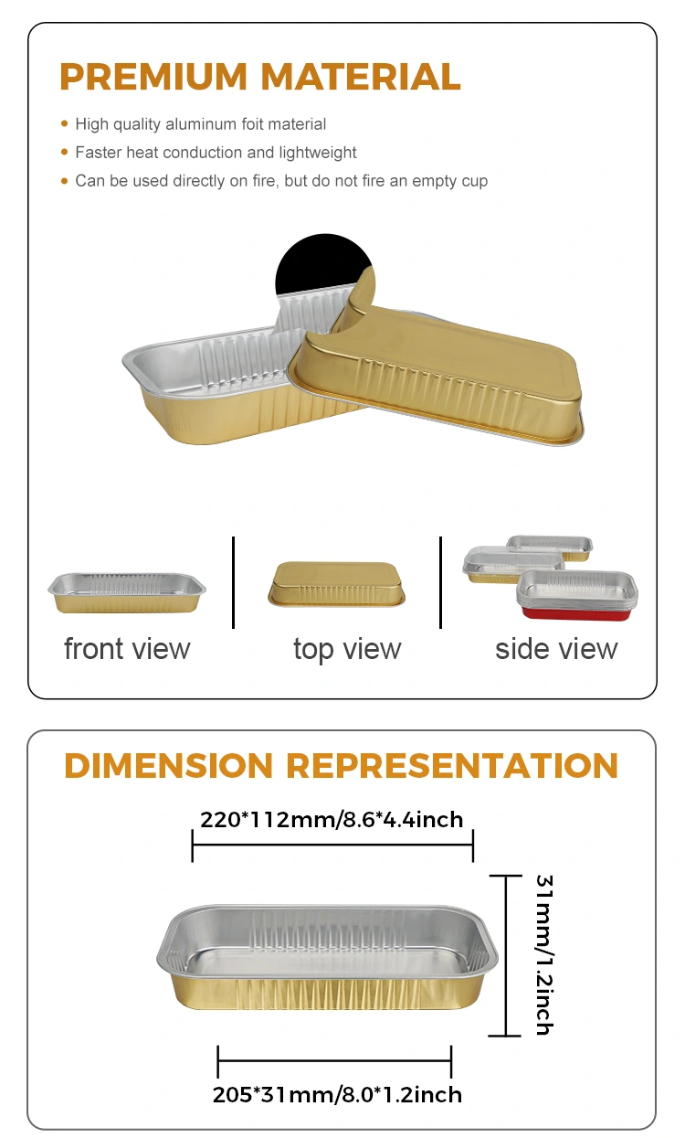 Алюминиевая фольга Yunchu является производителем и поставщиком прямоугольных контейнеров из алюминиевой фольги Smoothwall с золотым запеканием, изготовленных из пищевого материала 8011-0. Он подходит для различных сценариев, таких как киоски для барбекю, выпечка, семейные обеды, кемпинг и еда на вынос. Этот контейнер может не только удовлетворить потребности в ежедневной выпечке и других продуктах питания, но также продемонстрировать широкий спектр характеристик этого продукта в различных общественных местах. После строгого отбора продукции нашей компанией герметичность этого контейнера получила широкое признание среди торговцев, и он также может быть герметичным в сфере торговли на вынос.