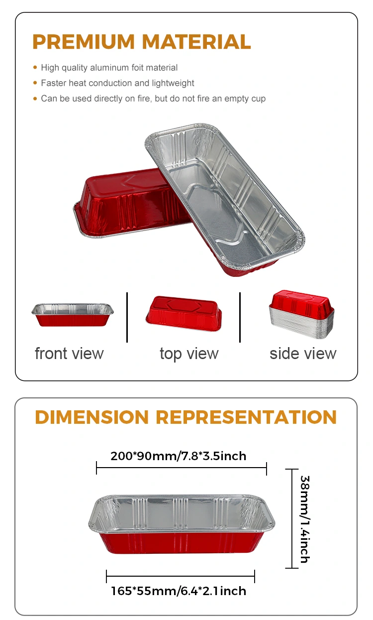 Прямоугольные красные контейнеры из серебряной алюминиевой фольги для хлебобулочных изделий от поставщика алюминиевой фольги Yunchu имеют прочную конструкцию, безопасную для использования в духовке. Они остаются стабильными даже при высоких температурах и открытом огне, выдерживая температуру выше 220 ℃, обеспечивая равномерное распределение тепла для предотвращения пригорания и прочную герметизацию для сохранения свежести (предотвращая попадание воздуха и влаги, сохраняя хлеб мягким даже после охлаждения). Они также предлагают экологические и эстетические преимущества. Изготовленные из пищевой алюминиевой фольги, они соответствуют стандартам переработки упаковки и могут быть переработаны законными способами после утилизации, что снижает нагрузку на окружающую среду, связанную с одноразовыми пластиковыми контейнерами. Удлиненная форма точно соответствует размерам буханок хлеба, сохраняя форму теста и предотвращая расширение и деформацию во время выпечки. Это гарантирует, что хлеб сохранит свой удлиненный вид после выпечки, что приведет к более привлекательному внешнему виду продукта, что особенно подходит для коммерческих помещений.