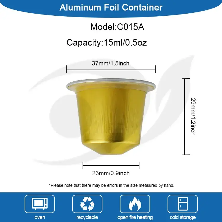 Yunchu Алюминиевая фольга Поставщик силиконовой пробел пустой капсулы кофе C015A в следующих размерах: верхний диаметр 37 мм (около 1,4 дюйма), диаметр база 23 мм (около 0,9 дюйма), высота 29 мм (около 1,1 дюйма). Эта капсула содержит 15 мл (около 0,5 унции) молотого кофе, кофе -жидкость. Подходит для всех машин Nespresso, упакованной эспрессо -жидкости и может даже расширяться с помощью полоскания азота. Кроме того, логотип и цвет также могут быть настроены, и рисунок может быть напечатан на крышке алюминиевой фольги, а логотип также может быть отпечатан на дне капсулы кофе.