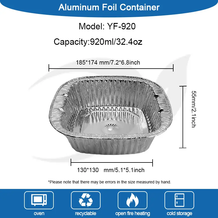 Yunchu aluminum foil model YF920 Square silver takeaway packing Aluminum Foil Container is widely used, the primary choice for customization such as dinners, shopping mall packaging, parties, buffets, takeaway delivery, etc., for a better experience for consumers, this Square silver takeaway packing Aluminum Foil Container The design adopts a square aluminum foil bowl design, the bottom is smooth and has a circular concave and Настройка выпуклости дизайна, так что не существует страха перед температурным открытым пламенем для эффективного рассеяния тепла и открытого пламени прямого сжигания, внешняя стенка контейнера имеет конструкцию конструкции жесткости, который может сделать общую структуру и руку также может быть стабильно захвачена, этот контейнер имеет конструкцию ручки на верхнем диаметре, который может быть легко извлечен после нагрева, и со свежим, что может быть вкусный вкусный.